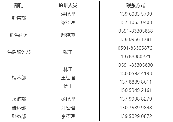 3、公司各部門值班人員及聯(lián)系方式如下: