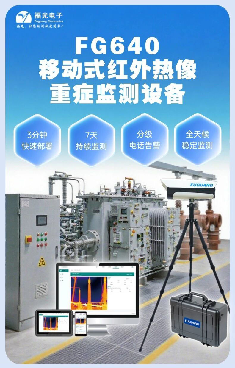 PA電子FG-640移動式紅外熱像重癥監測設備,可對電氣一次設備(變壓器、隔離開關、刀閘等電流致熱型設備)進行全場景、可追蹤監測。移動電源支持7天不間斷實時巡檢,及時發現熱異常與隱患,保障設備安全穩定運行。