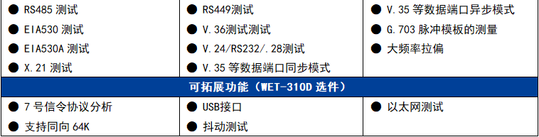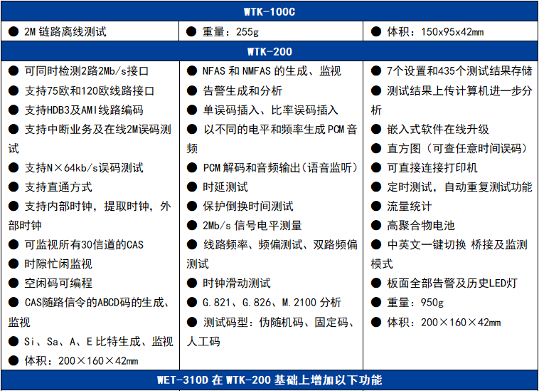 新推出的系列2M及數(shù)據(jù)鏈路綜合測(cè)試儀可用于測(cè)量與分析傳統(tǒng)E1傳輸系統(tǒng)的性能參數(shù)并處理各種故障。它們集誤碼測(cè)試、幀結(jié)構(gòu)分析、時(shí)隙分析、信念測(cè)試、信號(hào)分析、告警分析、PCM仿真等多種功能于一體。WET-310D還擁有更豐富的功能及選件功能。